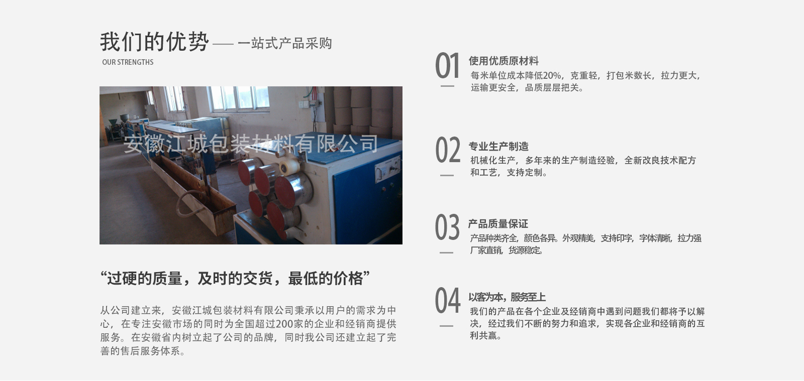 安徽江城包裝材料有限公司成立于2008年,注冊于2010年,公司總部設(shè)立在安徽蕪湖,是安徽省內(nèi)專業(yè)生產(chǎn)與銷售打包帶、透明膠帶的公司之一。公司主要效勞于大中小企業(yè),并大力開發(fā)省內(nèi)經(jīng)銷商。公司以“過硬的質(zhì)量,及時的交貨,低的價格”,為企業(yè)的立身之本。希望用我們的不懈努力,帶給我們客戶大的效益。從公司建立來,安徽江城包裝材料有限公司秉承以用戶的需求為中心,在專注安徽市場的同時為全國超過200家的企業(yè)和經(jīng)銷商提供服務(wù),“過硬的質(zhì)量,及時的交貨,低的價格”博得了縱多的企業(yè)和經(jīng)銷商的好評,在安徽省內(nèi)逐步樹立起了公司的品牌,同時我公司還建立起了完善的售后服務(wù)體系。為我們的產(chǎn)品在各個企業(yè)及經(jīng)銷商中遇到的問題予以解決,經(jīng)過我們不斷的努力和追求,實現(xiàn)各企業(yè)和經(jīng)銷商的互利共贏。
